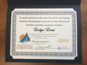 Congratulations to Evelyn Ernst for her 20 years of service to the Chester Bandstand concert series! Many thanks Evelyn for all you have done for Chester Brass and music in Chester!
