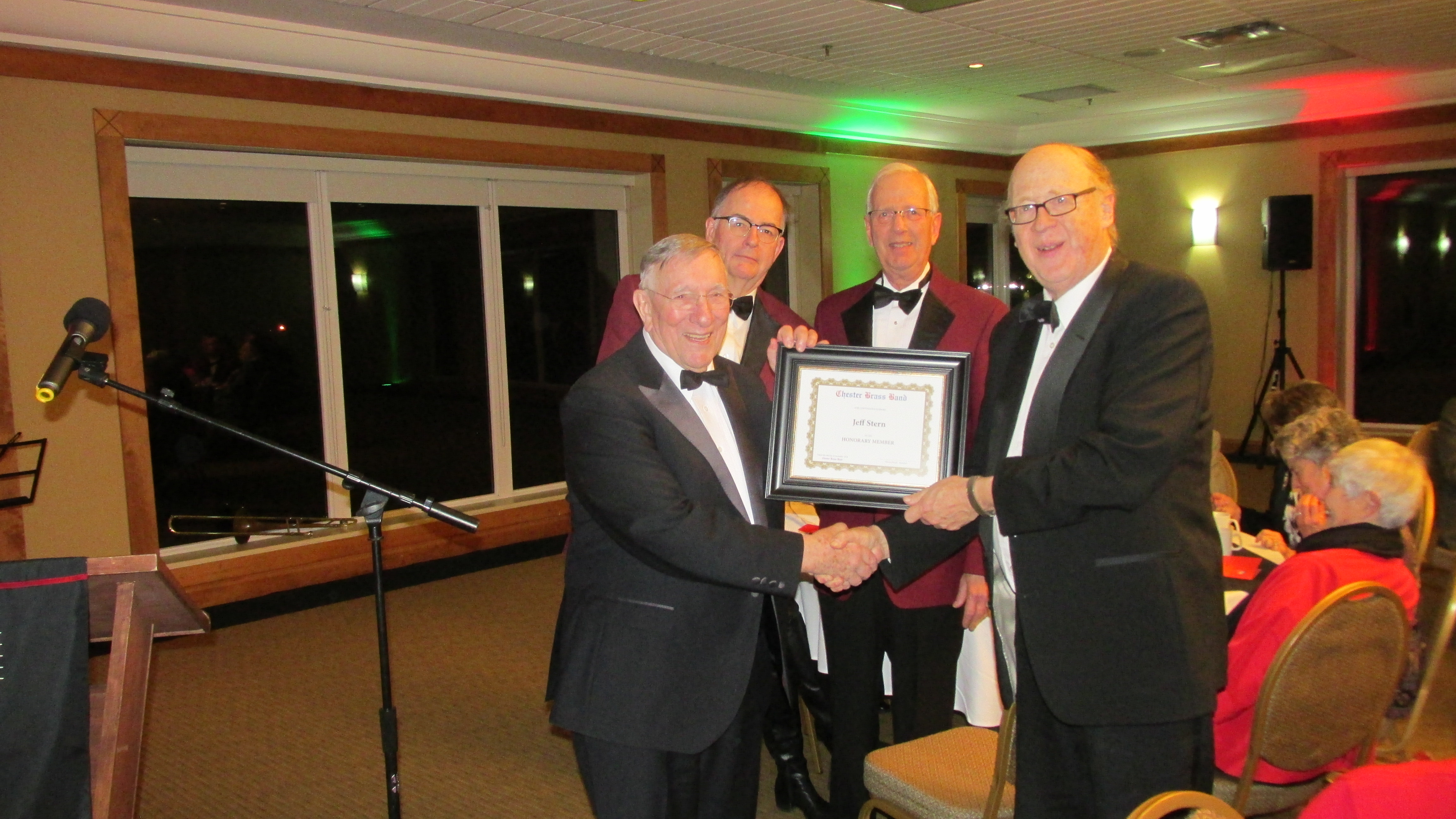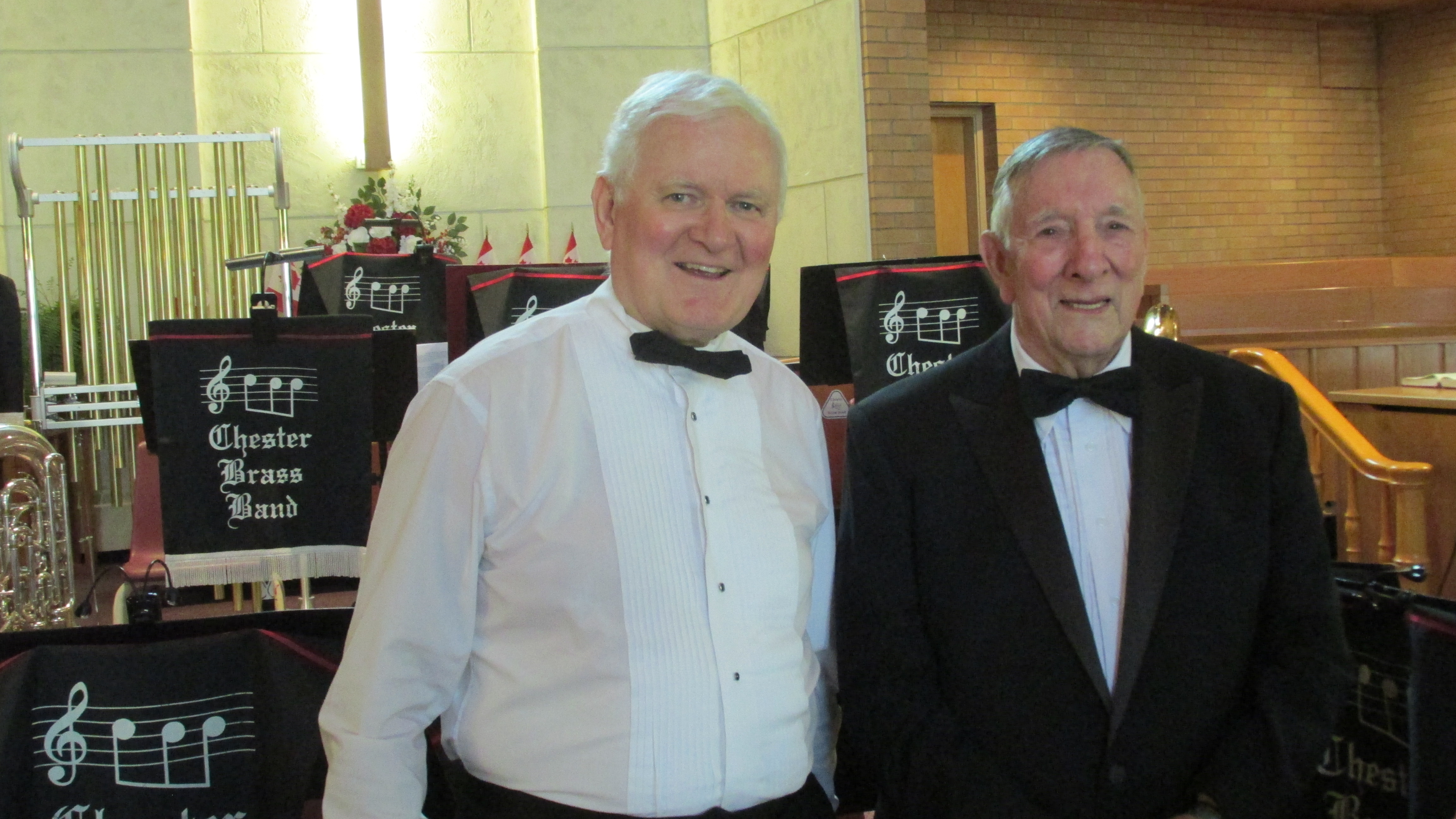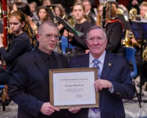 Nova Scotia Band Association President Steven Hartlen, left, presents the first ever Distinguished Band Director award to George Morrison, conductor of the Chester Brass Band. – Sunday February 25, 2018.